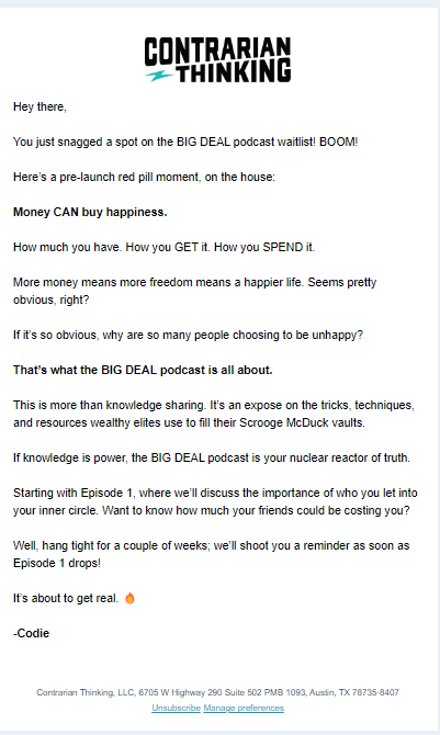 These were pre & post launch emails to announce and drive traffic to Codie Sanchez’s new podcast.